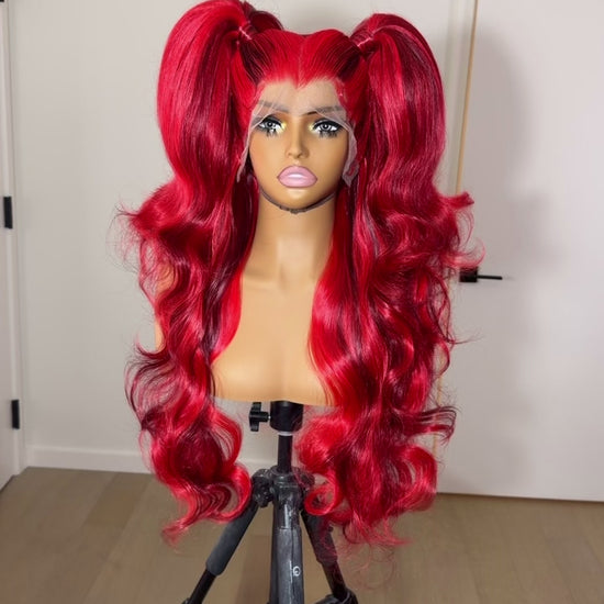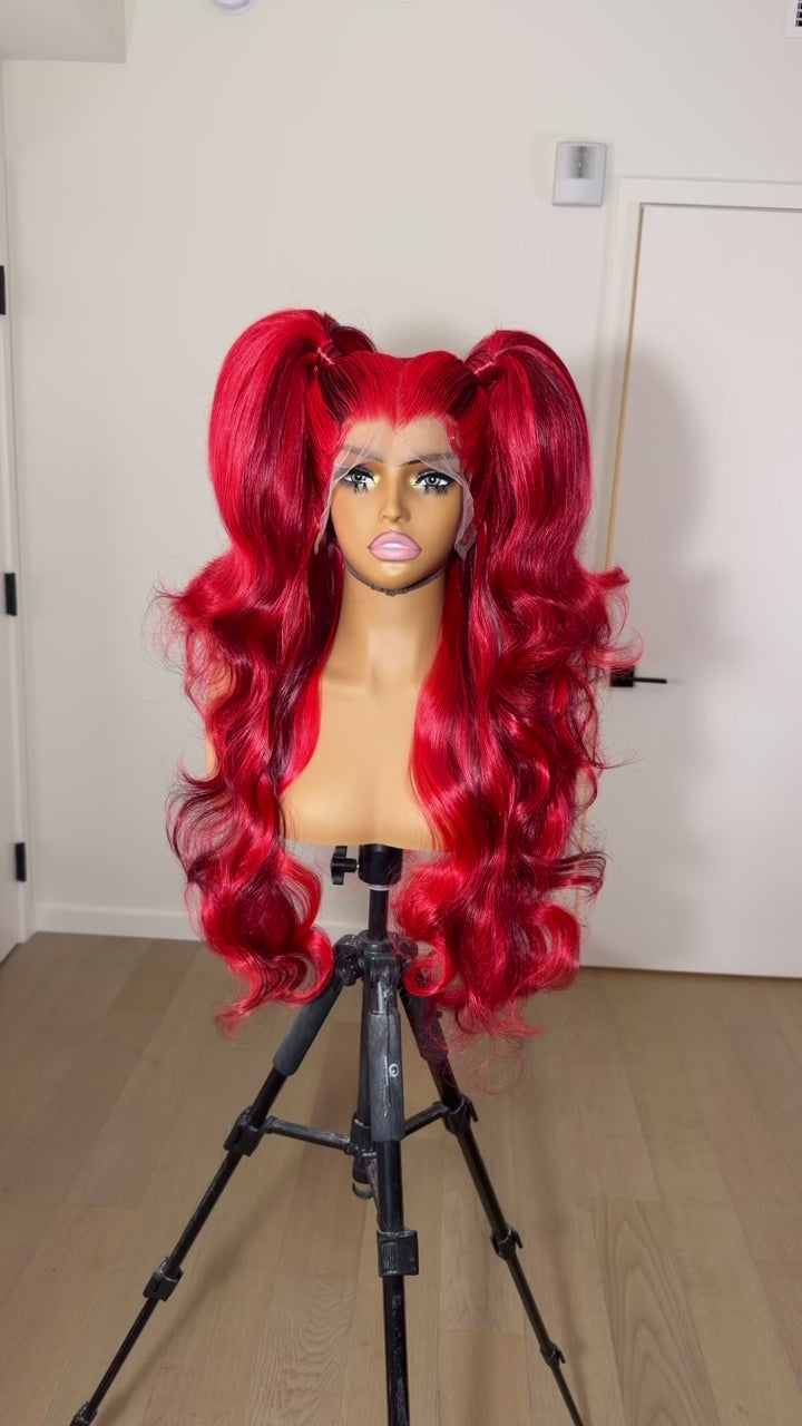 synthetic unit, medium cap, crimson doll pigtails with baby hairs, swipe to see video